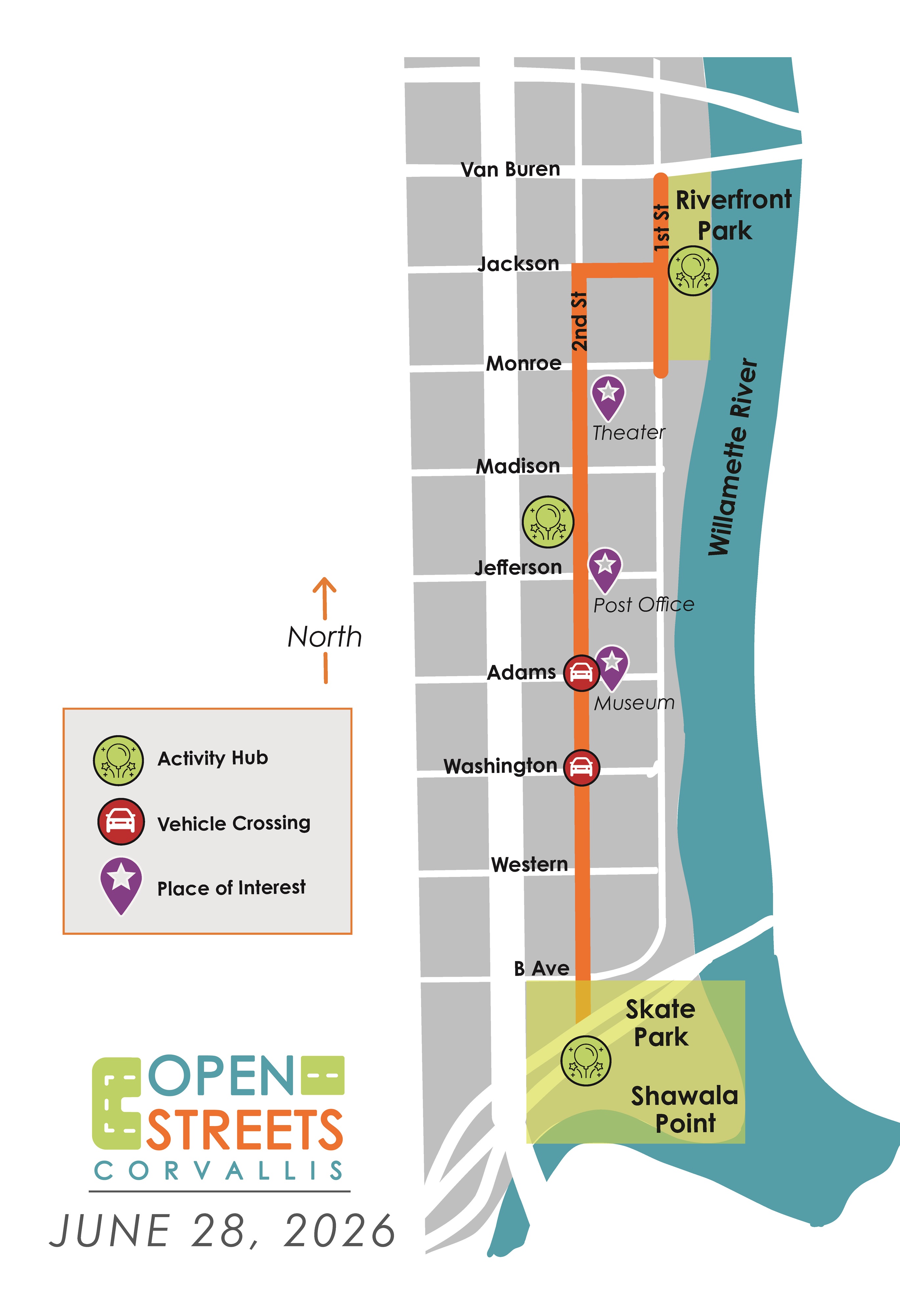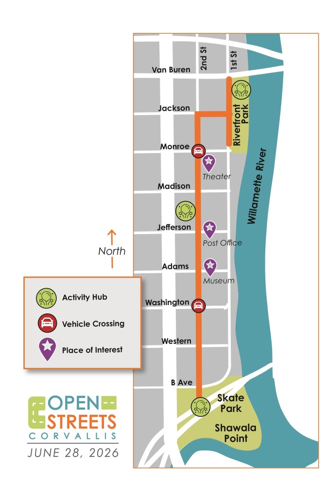 This year’s car-free route will travel along 2nd Street between Riverfront Park and the Skate Park in Downtown Corvallis.