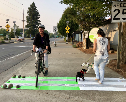 In Oregon, our laws state that every corner is a crosswalk. While some crosswalk locations are marked with traditional, wide, white painted lines, it is important for all of us to understand that even with no paint, a legal crossing exists at every corner or intersection. Crosswalk users can include people on foot as well as people using other forms of non-motorized transportation (wheelchairs, bicycles, skateboards, skates, scooters) and some forms of motorized transportation (power wheelchairs, personal mobility assistive devices). IMPORTANT: whenever entering a crosswalk, bicycles must “proceed at a walking pace” per Oregon Revised Statute (ORS) 814.410.