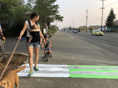 A: This is a good question and not as simple to answer as you might think! In Oregon, there is a correct way to use a crosswalk and it involves more than one step. Prior to crossing the street, a person must indicate their intent to cross. To do this, they must extend “some part or extension of themselves onto the roadway.” This can be as simple as starting to step off the curb, or holding your hand forward over the curb, or taking one step off of the curb. At the same time, you must give traffic a chance to notice you and yield to you. The Oregon Revised Statute actually states that a person cannot enter the crosswalk at a speed that “constitutes an immediate hazard” (ORS 814.040). By this rationale, people on mobility devices (bikes, skates, etc) need to enter the crosswalk at a walking pace.
