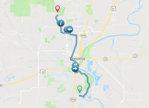 Did you know that you can get from one end of Corvallis to the other with just two traffic lights or less? In this writeup we’ll take you from the Willamette Landing neighborhood in south Corvallis all the way to the Timberhill neighborhood up north.