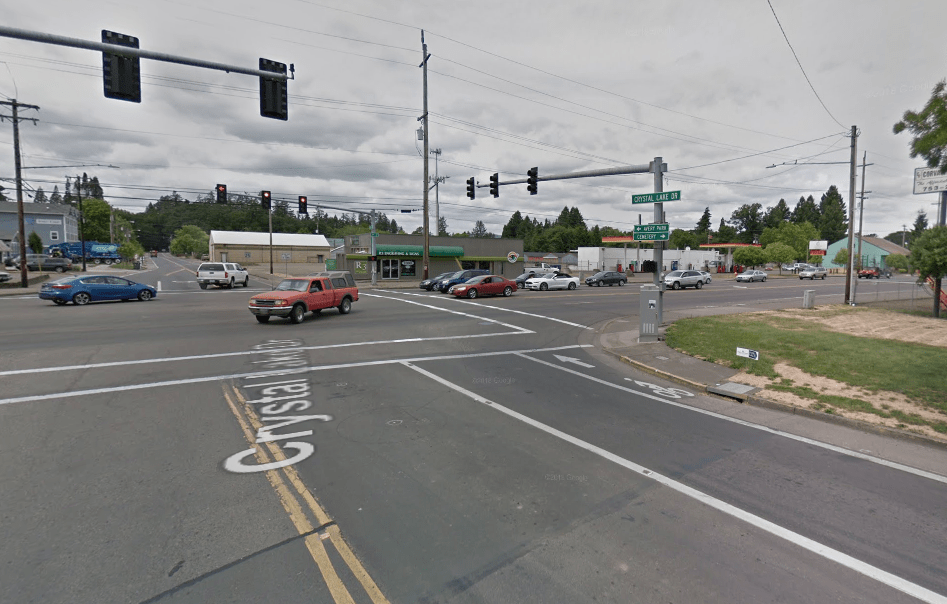 Let’s check out the traffic lights we’ll come across. The first is at Crystal Lake Dr and Hwy 99 (or 3rd St). This only really counts going southbound, because going northbound is a right-hand turn onto the multi-use path and there’s really no stop needed to get on the path. There’s also a bike lane along Hwy 99.